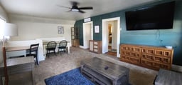 Open living room with dining table.